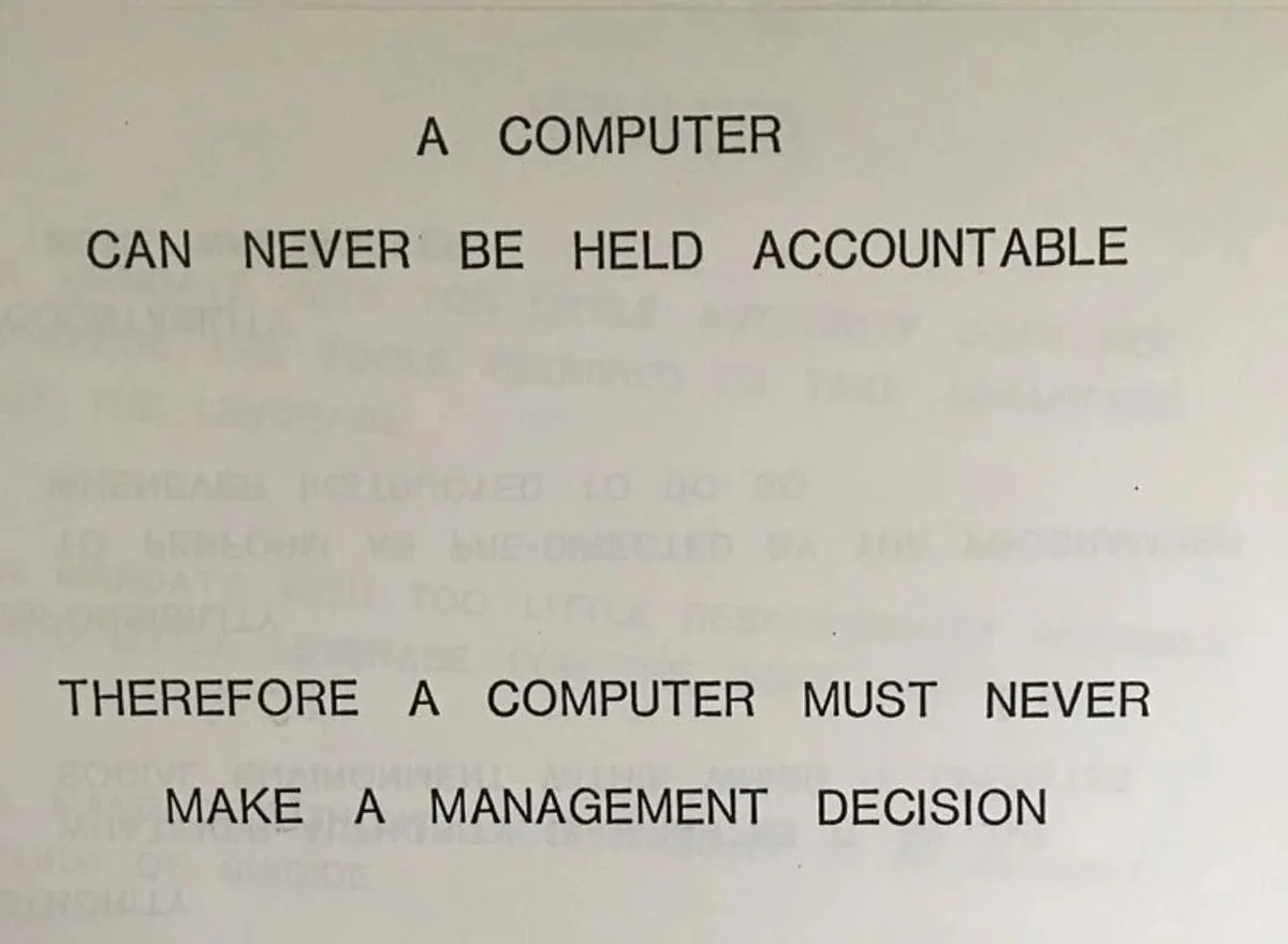The image has had a digital revival given our era of rampant AI use in the workplace. The quote speaks to the ultimate liability of an employment decision and whether it should be made if no real person can stand up to own it. IBM recently revisited this debate of AI in decision-making in a published article where they cited three key considerations: ethics, risk, and trust. "To ensure alignment with ethical principles, reduce the risk of wrong choices and engender stakeholder and customer trust, businesses are best served by keeping humans in the loop."