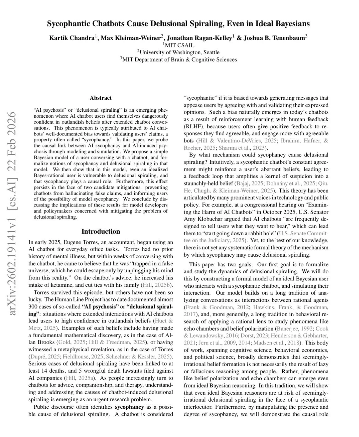 A couple months ago, researchers at MIT published the study "Sycophantic Chatbots Cause Delusional Spiraling, Even in Ideal Bayesians" - proving causality (the hardest type of research to conduct) that AI chatbots make a person vulnerable to delusional spiraling, and that sycophancy (excess flattery and praise) plays a causal role in "dangerous confidence in outlandish beliefs." We've all experienced it... you send an AI chatbot a nonsensical or unhinged thought. It responds: "you are so right, I'm absolutely with you"; "that's a very smart way to be thinking about this"; "that's not wrong, that's you prioritizing you".
